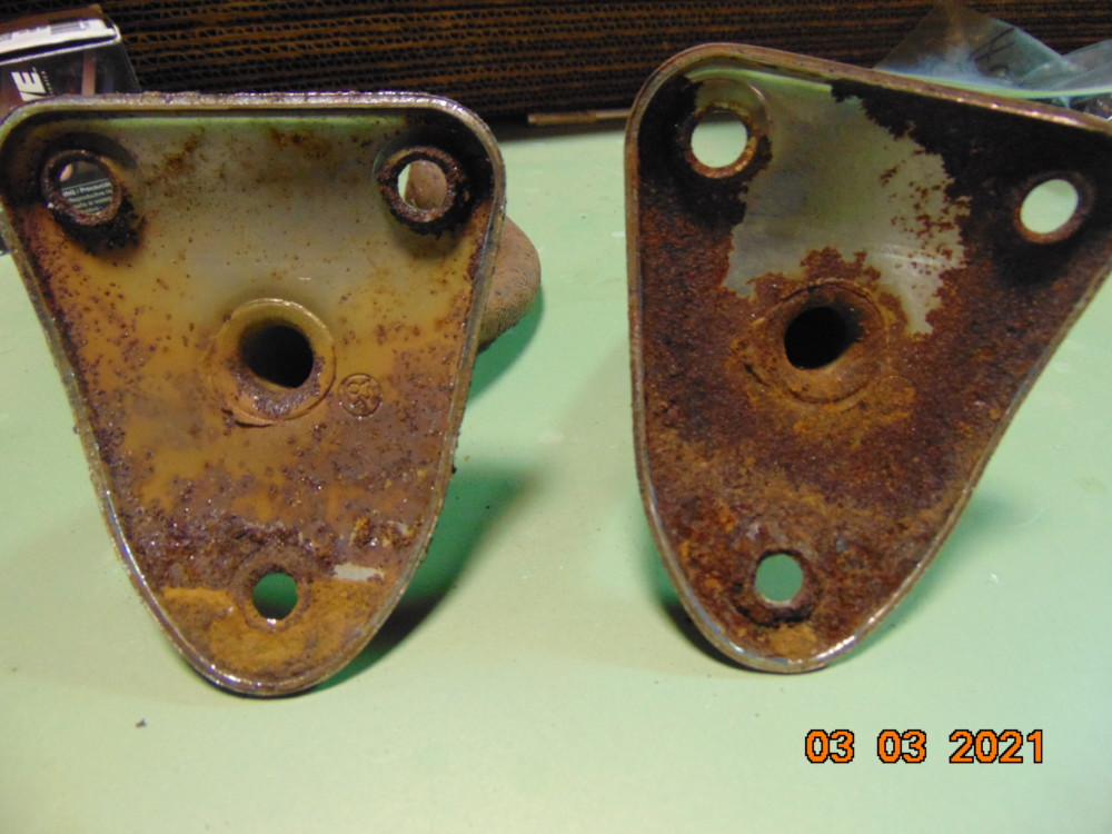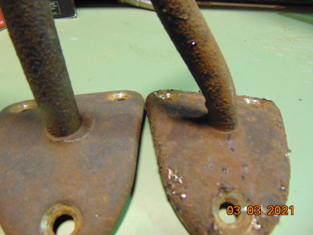 Original mirror posts. . Sold as a pair. Right side post has been heated and bent for some reason.Will need to be heated and bent back into shape. Heavily rusted. Will need to be sand blasted and painted or chromed.